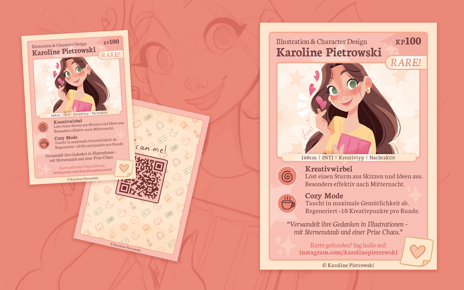 Die Karte kombiniert Character Design mit typischen Trading-Card-Elementen wie Seltenheitsstufe, Werten und „Fähigkeiten“. Eigenschaften wie Kreativität und Nachaktivität werden dabei humorvoll als Spielmechaniken inszeniert. Auf der Rückseite führt ein QR-Code direkt zu meinem Portfolio.